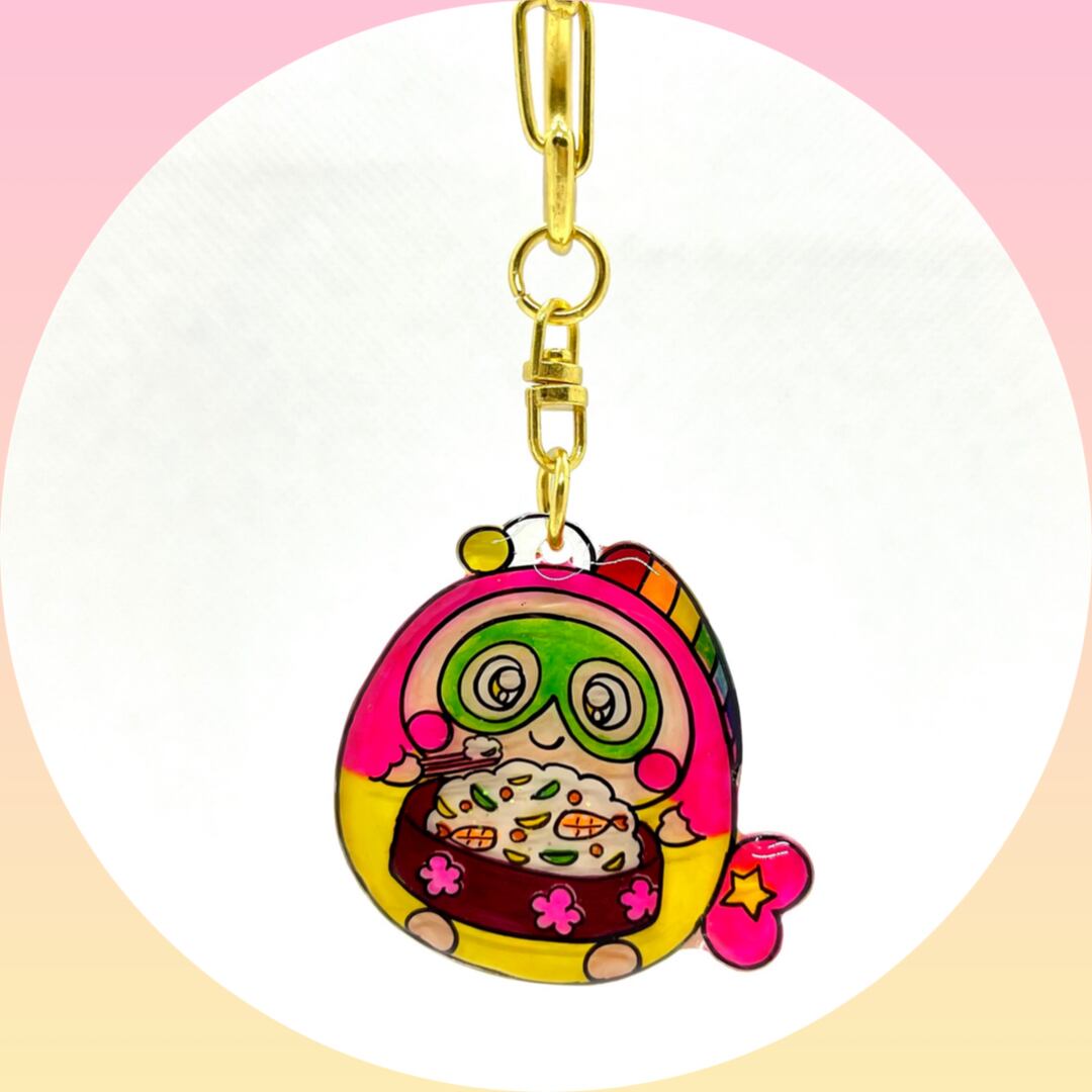 『プク丸ちゃんはくいしんぼう』シリーズより、食べることが大好きなプク丸ちゃんがちらし寿司をもぐもぐするキーホルダーです。