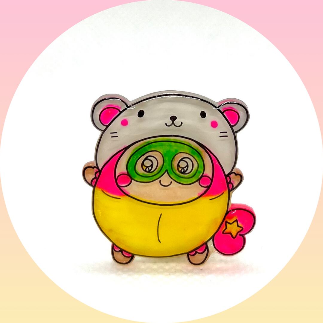 『かぶりもの』シリーズ(干支編)より、子年の被り物をしたプク丸ちゃんのブローチです。