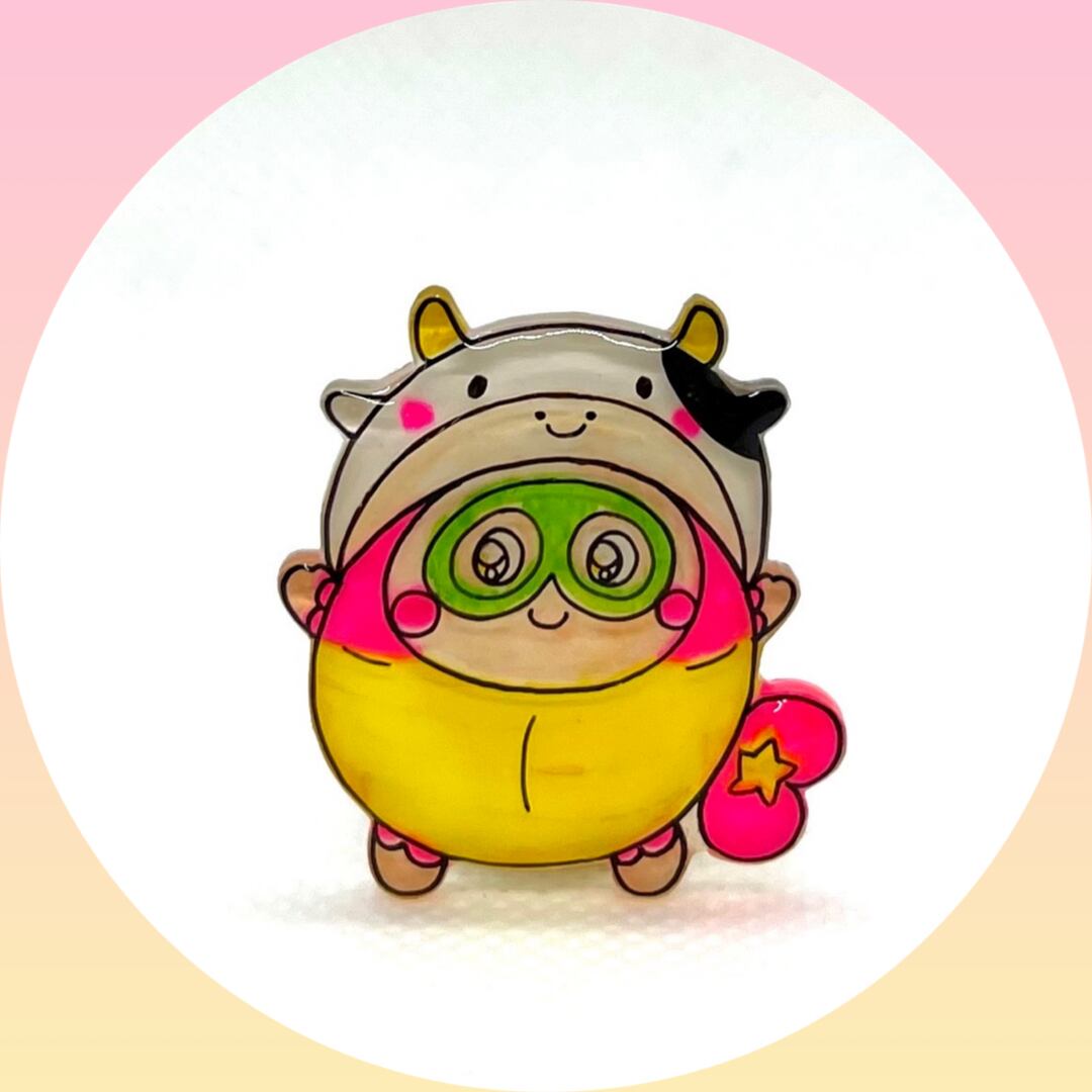 『かぶりもの』シリーズ(干支編)より、丑年の被り物をしたプク丸ちゃんのブローチです。