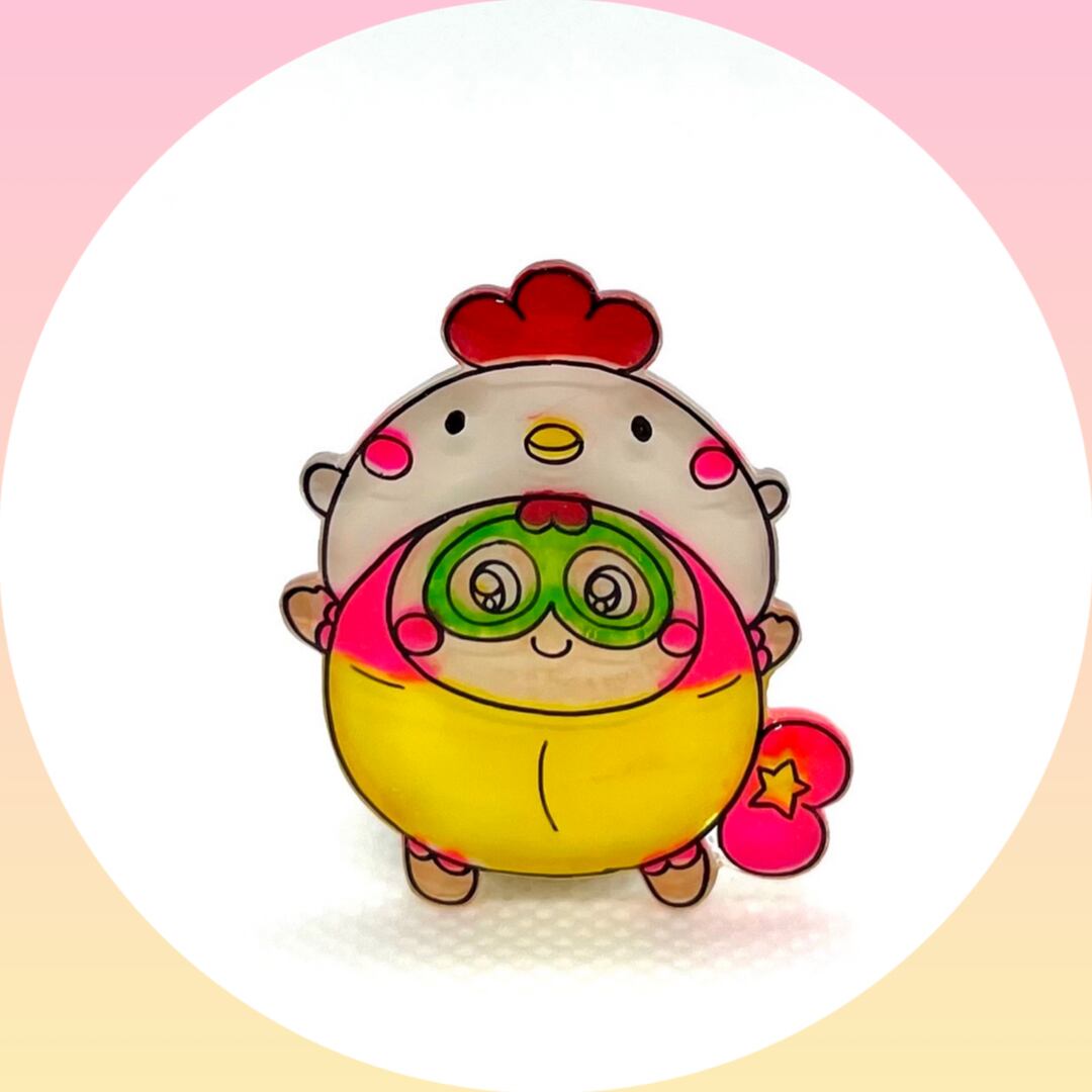 『かぶりもの』シリーズ(干支編)より、酉年の被り物をしたプク丸ちゃんのブローチです。