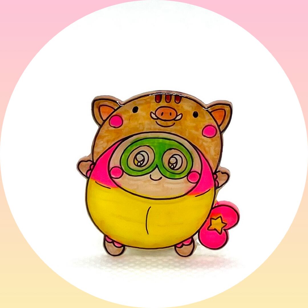 『かぶりもの』シリーズ(干支編)より、亥年の被り物をしたプク丸ちゃんのブローチです。