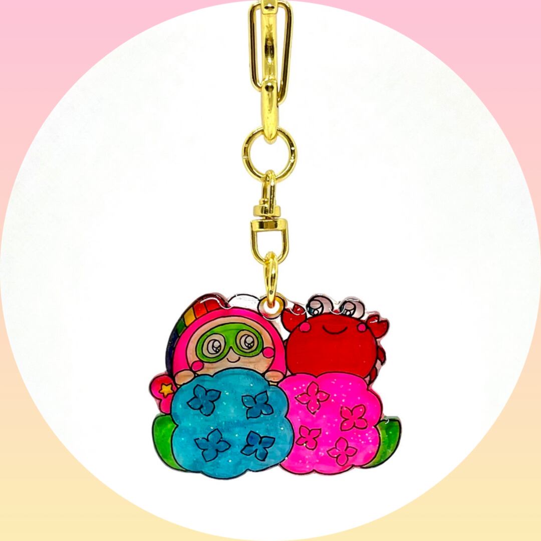 そんなプク丸ちゃんが、仲良しのカニちゃんと一緒に紫陽花を愛でるキーホルダーです。